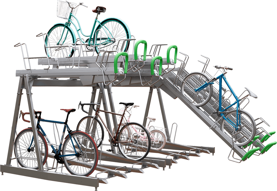 Двухуровневая система хранения и парковки велосипедов из оцинкованной стали и анодированного алюминия для использования на улице и в помещениях.